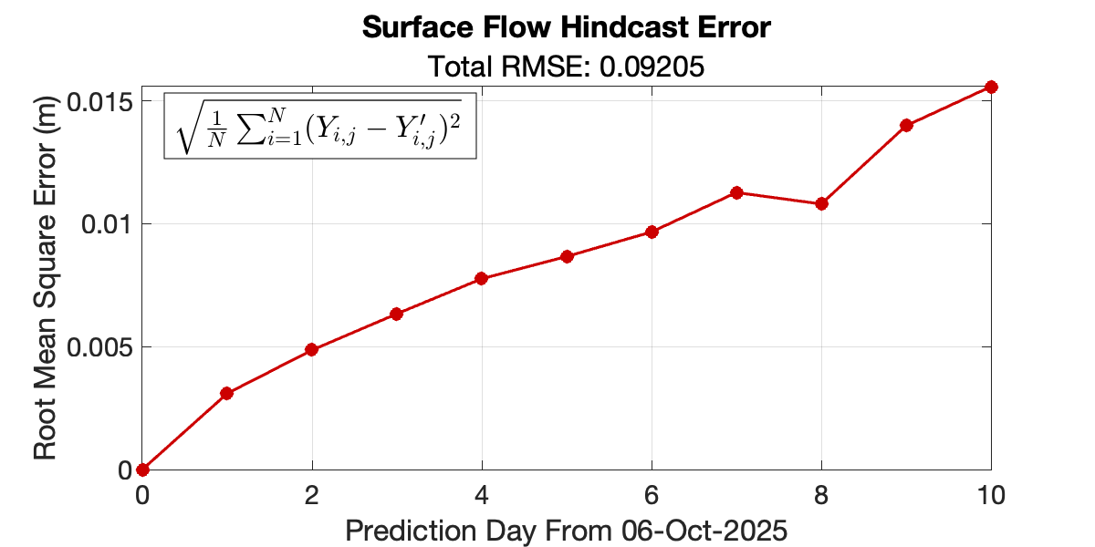 Predictions of ocean surface flow are generated using an Echo State Network (ESN). The ESN predicts Sea Level Anomaly (SLA), which is converted to surface flow. The hindcast data below can be used to determine the prediction skill. The forecast data below can be used to optimize future control strategies. See available plots in the list below.