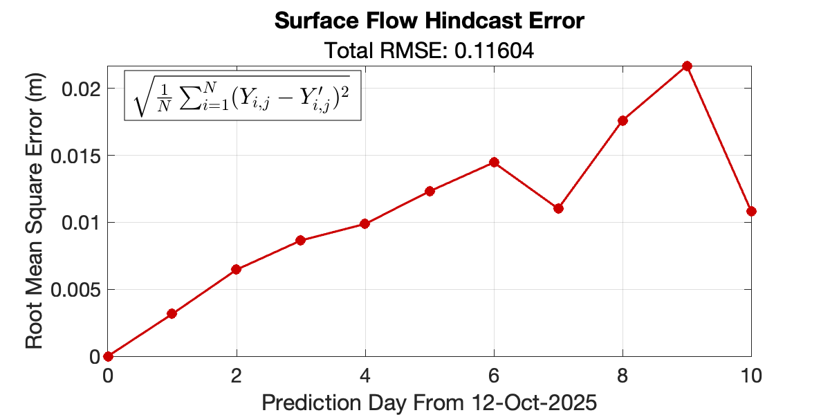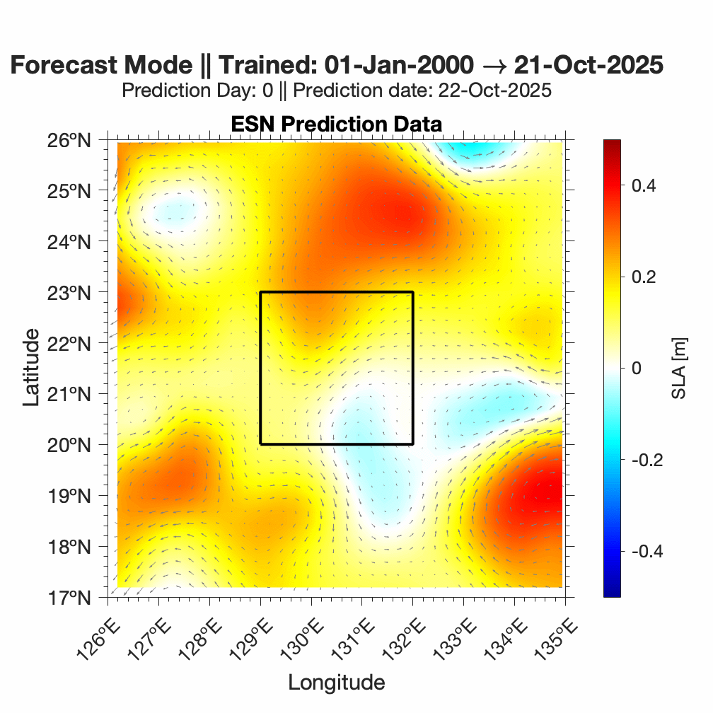 Predictions of ocean surface flow are generated using an Echo State Network (ESN). The ESN predicts Sea Level Anomaly (SLA), which is converted to surface flow. The hindcast data below can be used to determine the prediction skill. The forecast data below can be used to optimize future control strategies. See available plots in the list below.