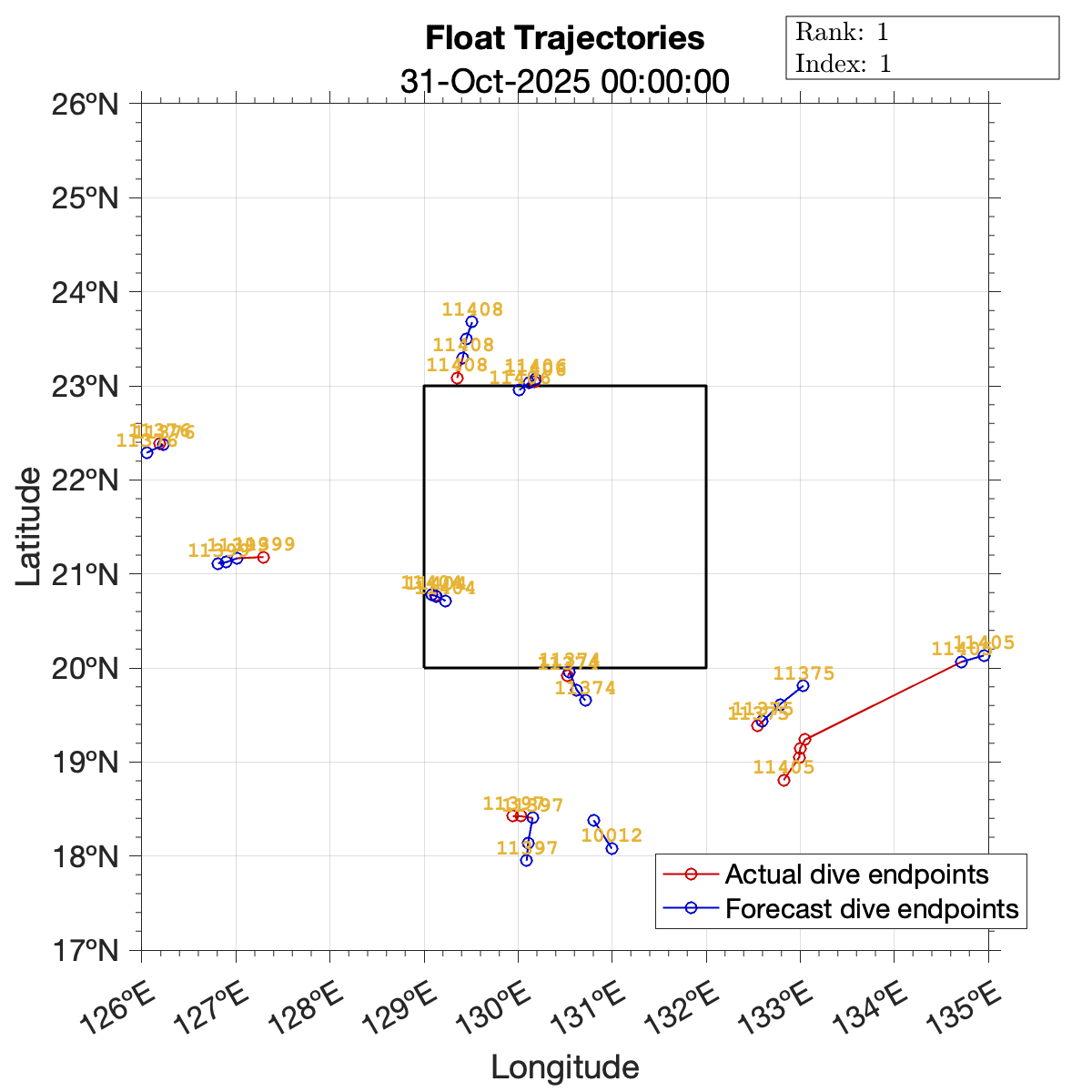 This page contains information related to the remote operation of autonomous oceans floats. The software used here is called FloatCast. Each section below contains relevant information from various points in the FloatCast processes. The components highlighted are related to (1) the ocean surface flow predictions, (2) the optimized float command files, (3) the float trajectory predictions, (4) and the scoring of candidate command sets. Data from all or some of these components may be posted below.