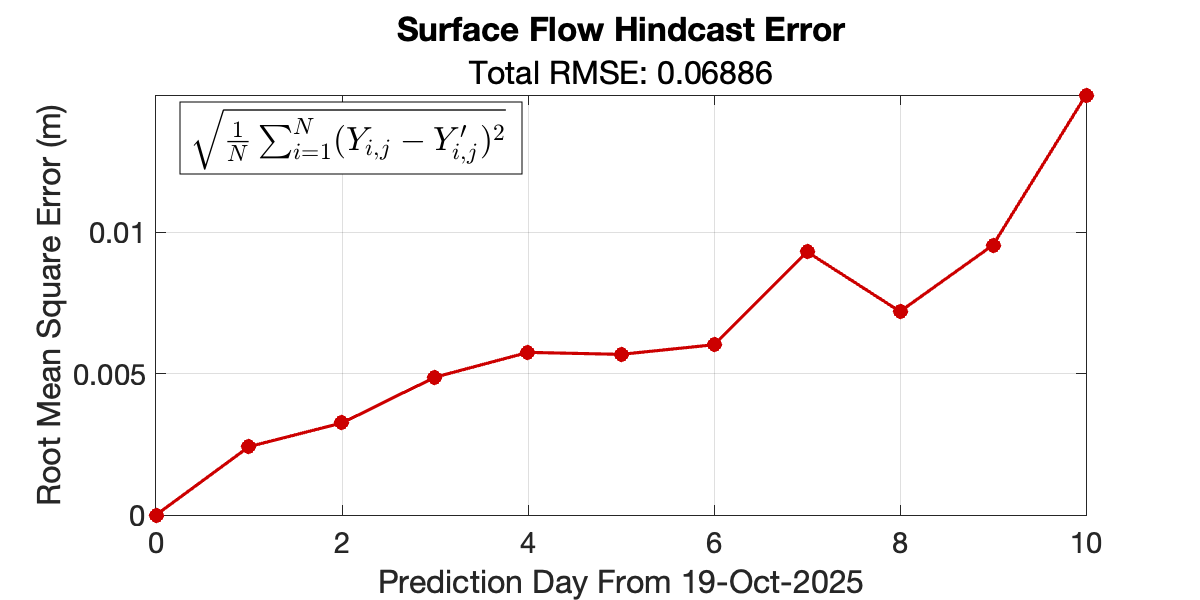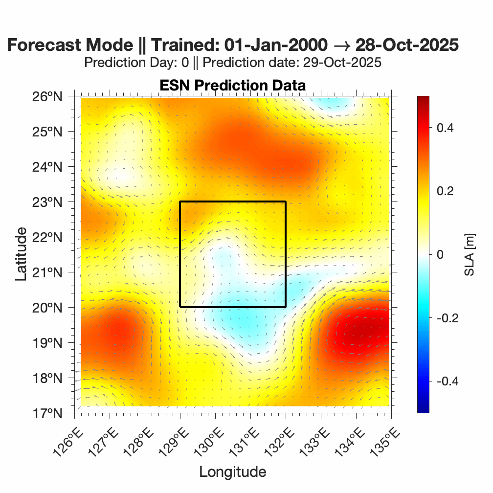 Predictions of ocean surface flow are generated using an Echo State Network (ESN). The ESN predicts Sea Level Anomaly (SLA), which is converted to surface flow. The hindcast data below can be used to determine the prediction skill. The forecast data below can be used to optimize future control strategies. See available plots in the list below.