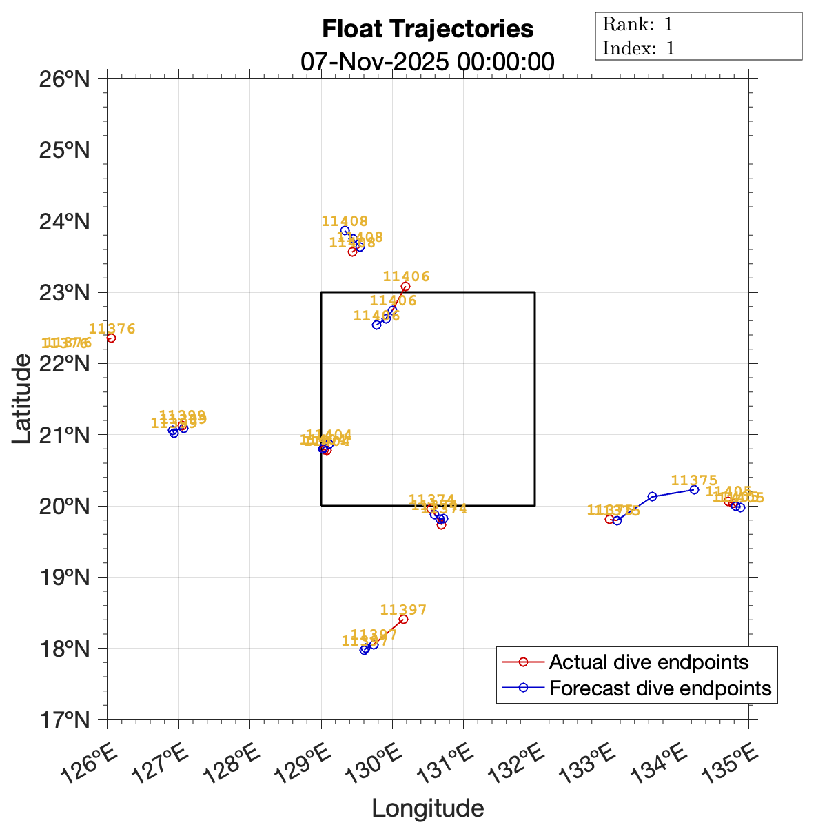 This page contains information related to the remote operation of autonomous oceans floats. The software used here is called FloatCast. Each section below contains relevant information from various points in the FloatCast processes. The components highlighted are related to (1) the ocean surface flow predictions, (2) the optimized float command files, (3) the float trajectory predictions, (4) and the scoring of candidate command sets. Data from all or some of these components may be posted below.