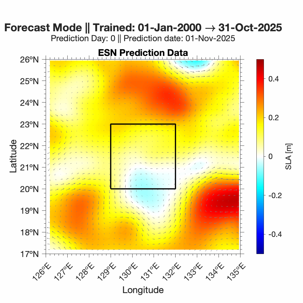 Forecasts of ocean surface flow are generated using an Echo State Network (ESN). The ESN predicts Sea Level Anomaly (SLA), which is converted to surface flow. Hindcast data below can be used to assess prediction skill. The forecast data below can be used to optimize future control strategies. See available plots in the list below.