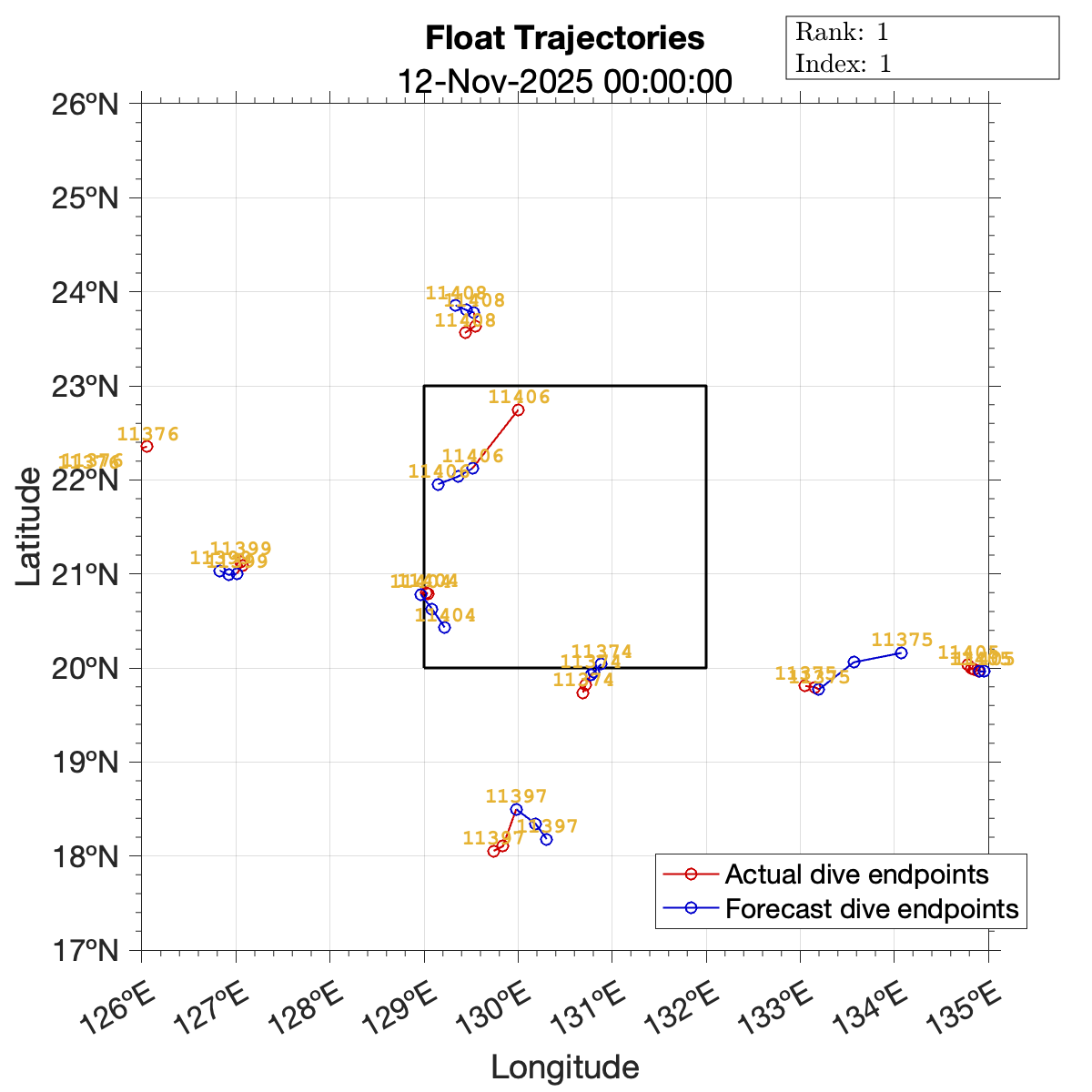 Suggested float command sets are included below. These commands have been optimized with respect to the mapping error scoring metric while using ocean surface flow forecasts to inform trajectory predictions.