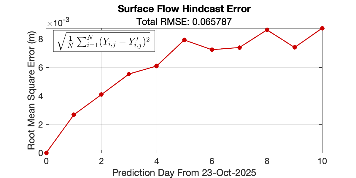 Forecasts of ocean surface flow are generated using an Echo State Network (ESN). The ESN predicts Sea Level Anomaly (SLA), which is converted to surface flow. Hindcast data below can be used to assess prediction skill. The forecast data below can be used to optimize future control strategies. See available plots in the list below.