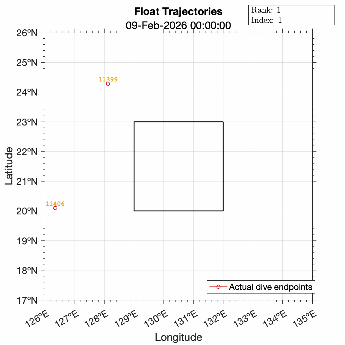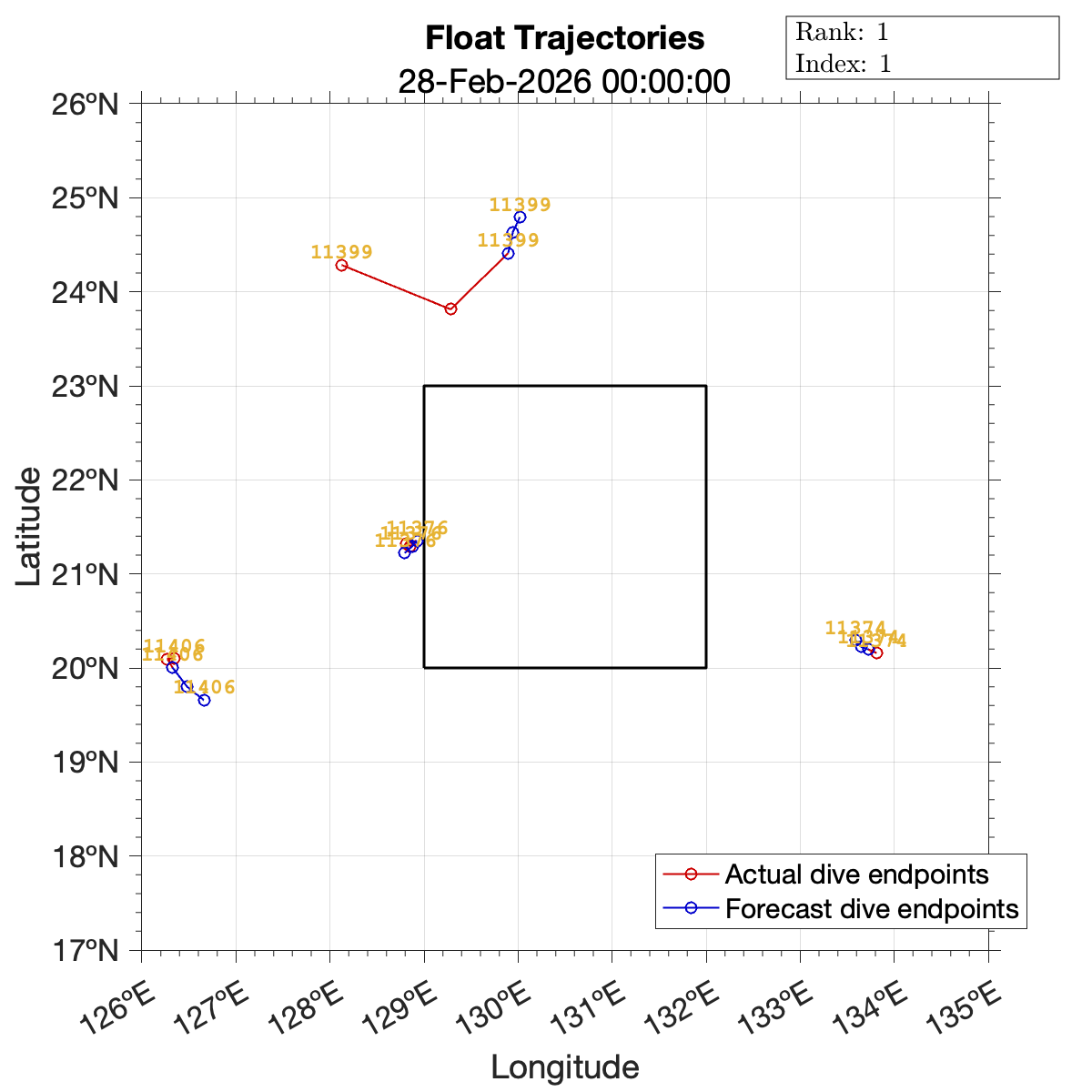 Suggested float command sets are included below. These commands have been optimized with respect to the mapping error scoring metric while using ocean surface flow forecasts to inform trajectory predictions.