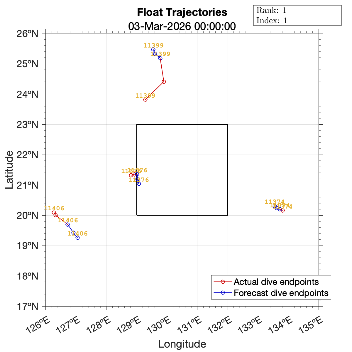 Suggested float command sets are included below. These commands have been optimized with respect to the mapping error scoring metric while using ocean surface flow forecasts to inform trajectory predictions.
