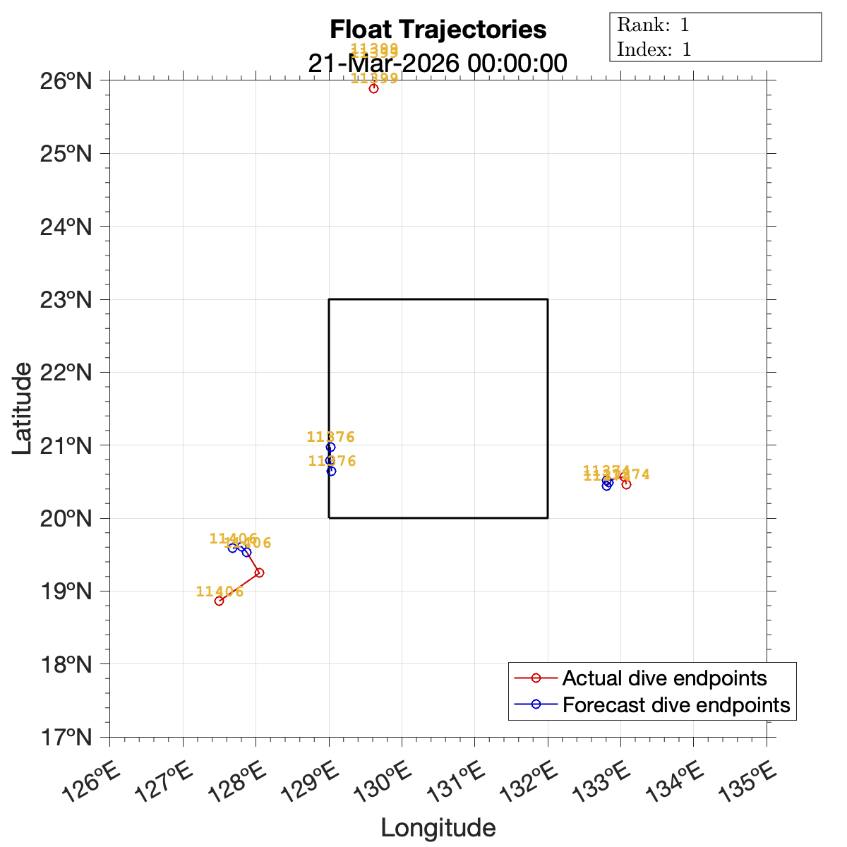 This page contains information related to the remote operation of autonomous oceans floats. The software used here is called FloatCast. Each section below contains relevant information from various points in the FloatCast workflow. The components highlighted are related to (1) the ocean surface flow forecasts, (2) the optimized float command files, (3) the float trajectory predictions, (4) and the scoring of candidate command sets. Data from all or some of these components may be posted below.
