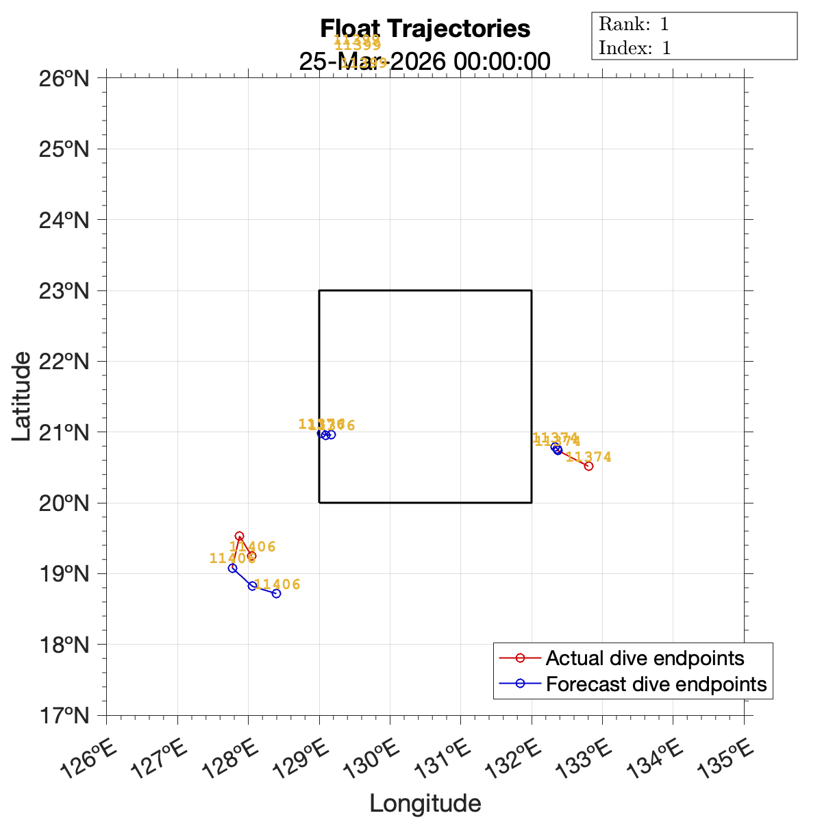 Plots showing the predicted float trajectories are generated based on a particle model of the vehicle dynamics. In the model, the float moves in the same direction as the surface flow, but with a magnitude that decays exponentially with depth. List items below with the same number correspond to the same prediction data.