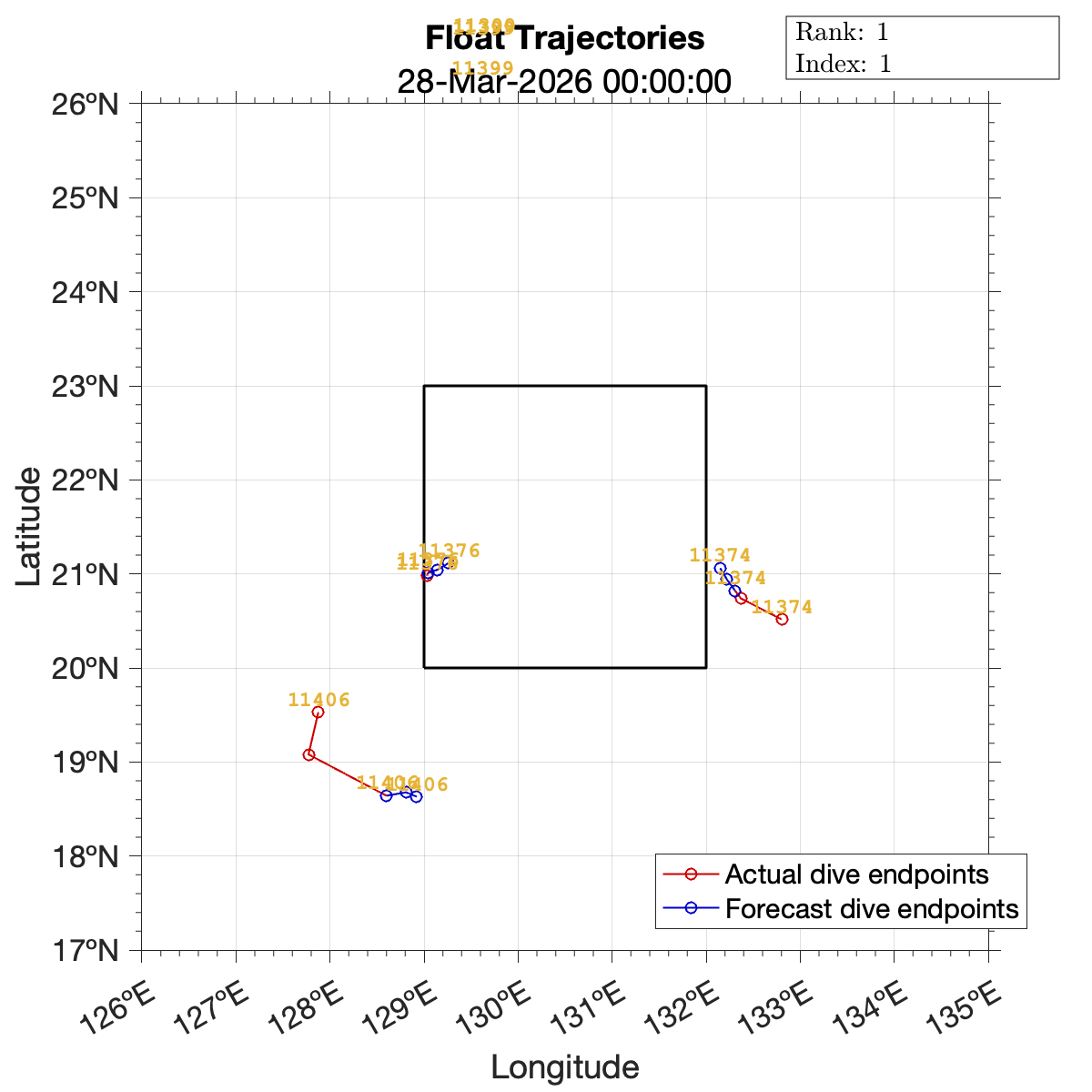 Plots showing the predicted float trajectories are generated based on a particle model of the vehicle dynamics. In the model, the float moves in the same direction as the surface flow, but with a magnitude that decays exponentially with depth. List items below with the same number correspond to the same prediction data.