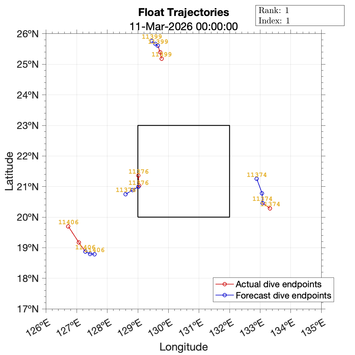 This page contains information related to the remote operation of autonomous oceans floats. The software used here is called FloatCast. Each section below contains relevant information from various points in the FloatCast workflow. The components highlighted are related to (1) the ocean surface flow forecasts, (2) the optimized float command files, (3) the float trajectory predictions, (4) and the scoring of candidate command sets. Data from all or some of these components may be posted below.