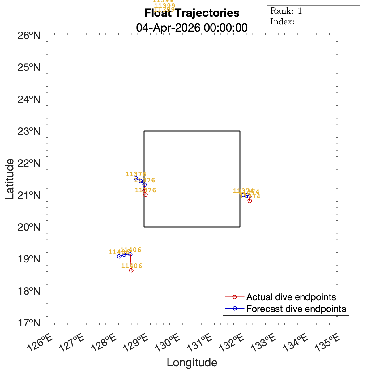 This page contains information related to the remote operation of autonomous oceans floats. The software used here is called FloatCast. Each section below contains relevant information from various points in the FloatCast workflow. The components highlighted are related to (1) the ocean surface flow forecasts, (2) the optimized float command files, (3) the float trajectory predictions, (4) and the scoring of candidate command sets. Data from all or some of these components may be posted below.
