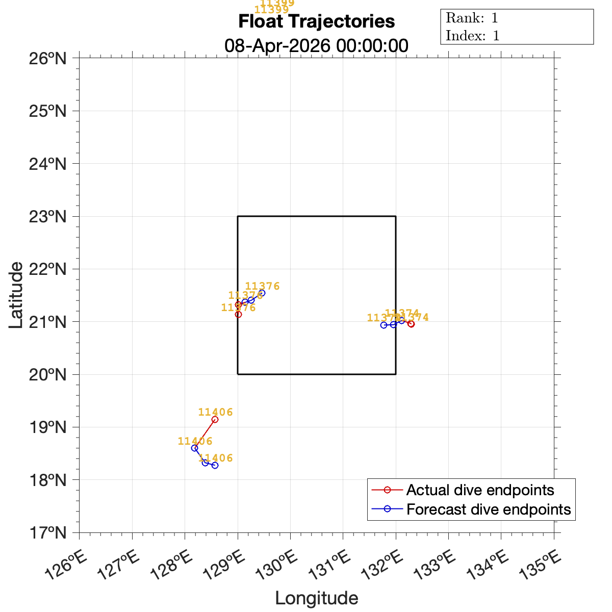 This page contains information related to the remote operation of autonomous oceans floats. The software used here is called FloatCast. Each section below contains relevant information from various points in the FloatCast workflow. The components highlighted are related to (1) the ocean surface flow forecasts, (2) the optimized float command files, (3) the float trajectory predictions, (4) and the scoring of candidate command sets. Data from all or some of these components may be posted below.