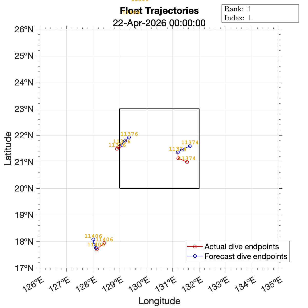 This page contains information related to the remote operation of autonomous oceans floats. The software used here is called FloatCast. Each section below contains relevant information from various points in the FloatCast workflow. The components highlighted are related to (1) the ocean surface flow forecasts, (2) the optimized float command files, (3) the float trajectory predictions, (4) and the scoring of candidate command sets. Data from all or some of these components may be posted below.
