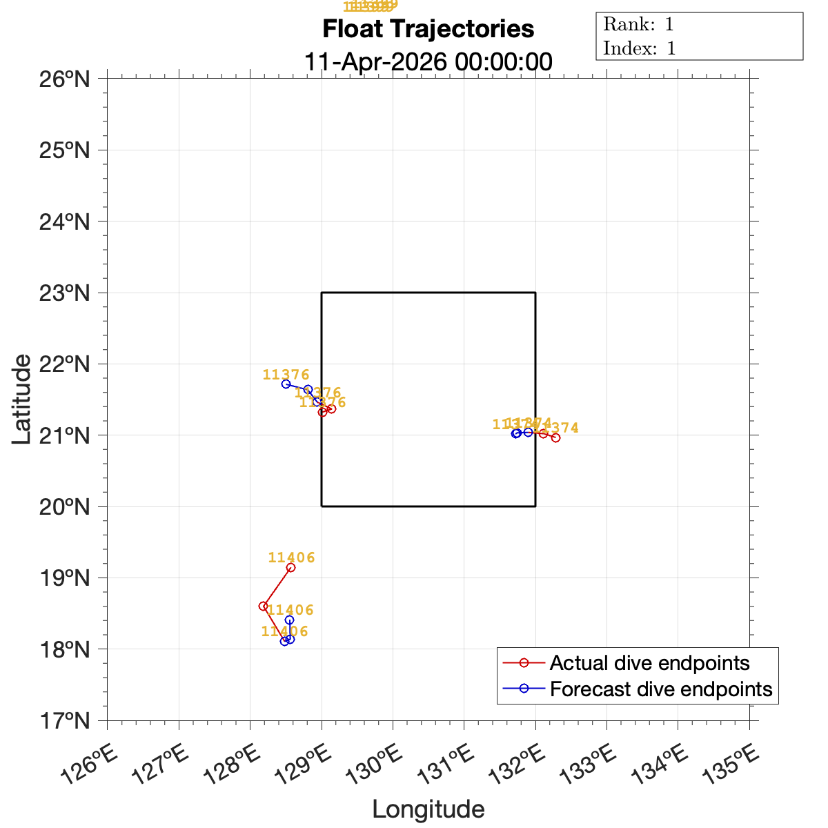 This page contains information related to the remote operation of autonomous oceans floats. The software used here is called FloatCast. Each section below contains relevant information from various points in the FloatCast workflow. The components highlighted are related to (1) the ocean surface flow forecasts, (2) the optimized float command files, (3) the float trajectory predictions, (4) and the scoring of candidate command sets. Data from all or some of these components may be posted below.