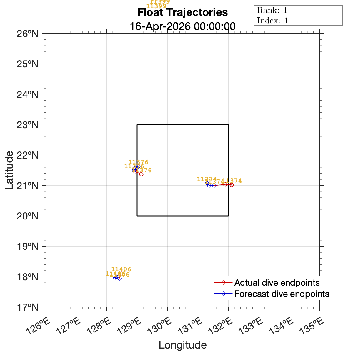 Plots showing the predicted float trajectories are generated based on a particle model of the vehicle dynamics. In the model, the float moves in the same direction as the surface flow, but with a magnitude that decays exponentially with depth. List items below with the same number correspond to the same prediction data.
