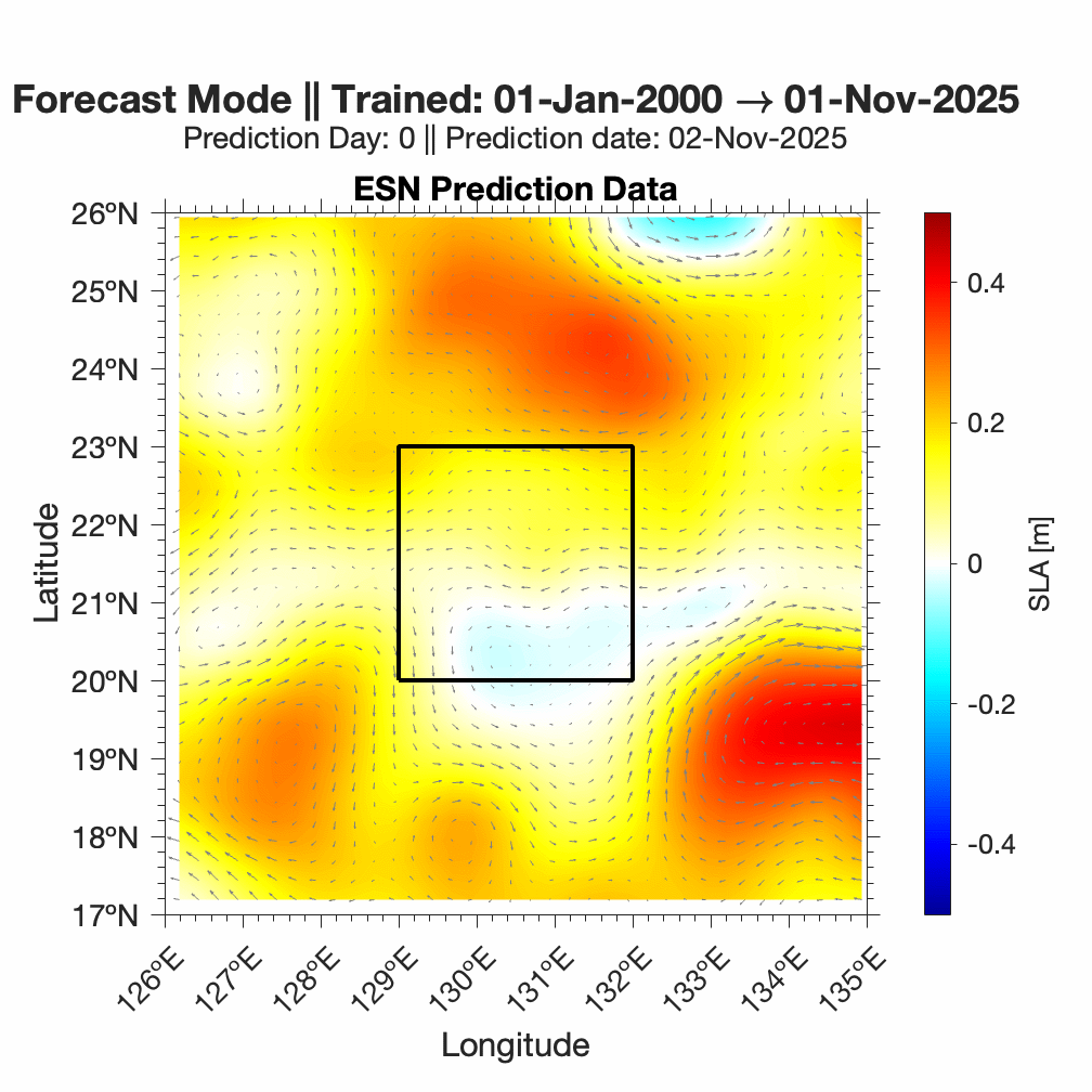 Forecasts of ocean surface flow are generated using an Echo State Network (ESN). The ESN predicts Sea Level Anomaly (SLA), which is converted to surface flow. Hindcast data below can be used to assess prediction skill. The forecast data below can be used to optimize future control strategies. See available plots in the list below.