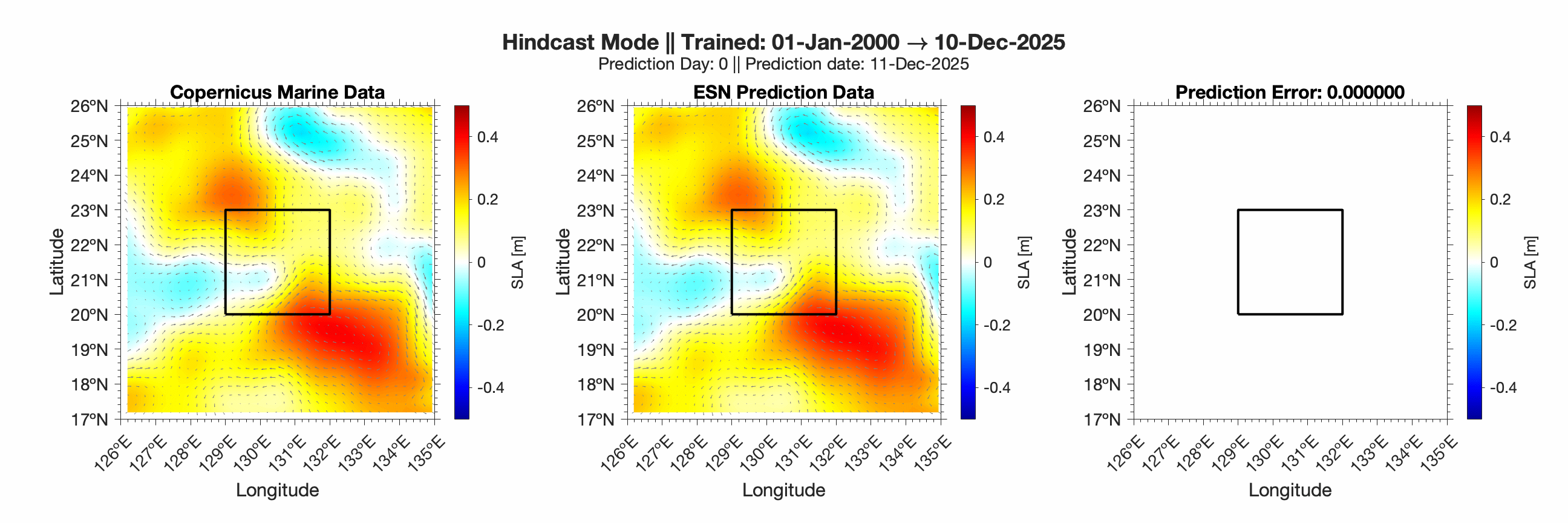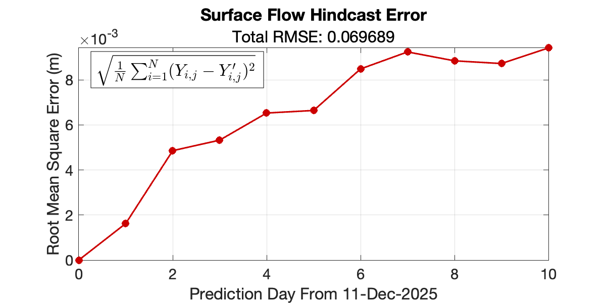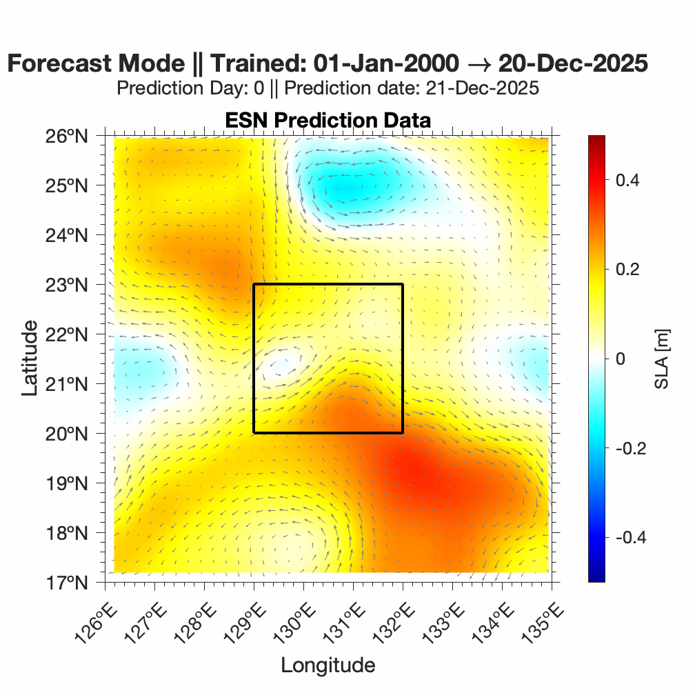 Forecasts of ocean surface flow are generated using an Echo State Network (ESN). The ESN predicts Sea Level Anomaly (SLA), which is converted to surface flow. Hindcast data below can be used to assess prediction skill. The forecast data below can be used to optimize future control strategies. See available plots in the list below.