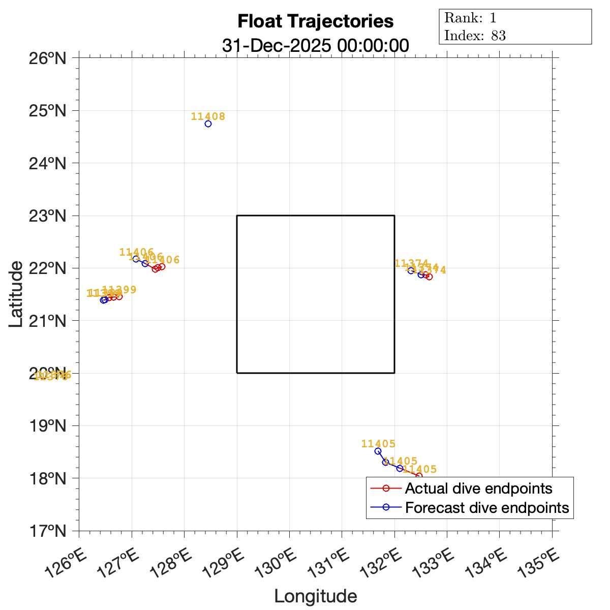 Suggested float command sets are included below. These commands have been optimized with respect to the mapping error scoring metric while using ocean surface flow forecasts to inform trajectory predictions.