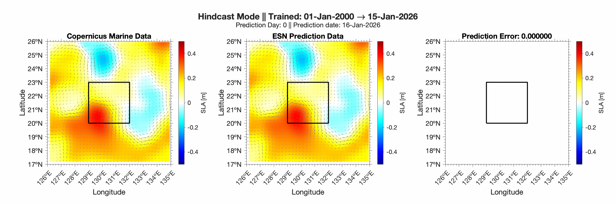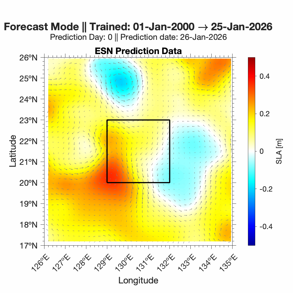 Forecasts of ocean surface flow are generated using an Echo State Network (ESN). The ESN predicts Sea Level Anomaly (SLA), which is converted to surface flow. Hindcast data below can be used to assess prediction skill. The forecast data below can be used to optimize future control strategies. See available plots in the list below.
