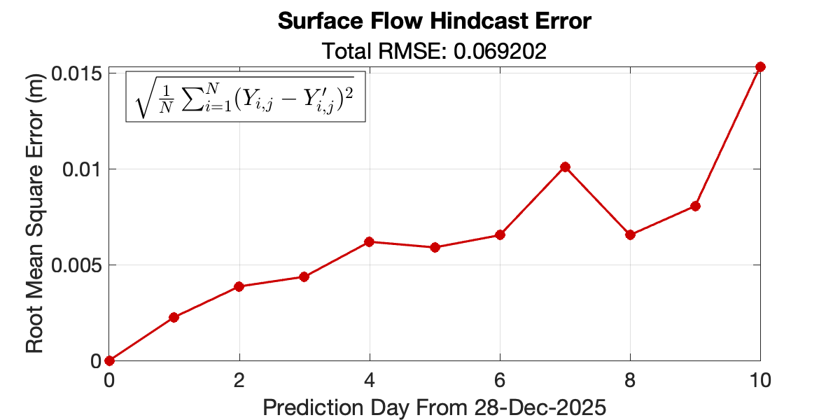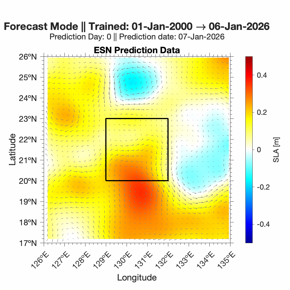 Forecasts of ocean surface flow are generated using an Echo State Network (ESN). The ESN predicts Sea Level Anomaly (SLA), which is converted to surface flow. Hindcast data below can be used to assess prediction skill. The forecast data below can be used to optimize future control strategies. See available plots in the list below.