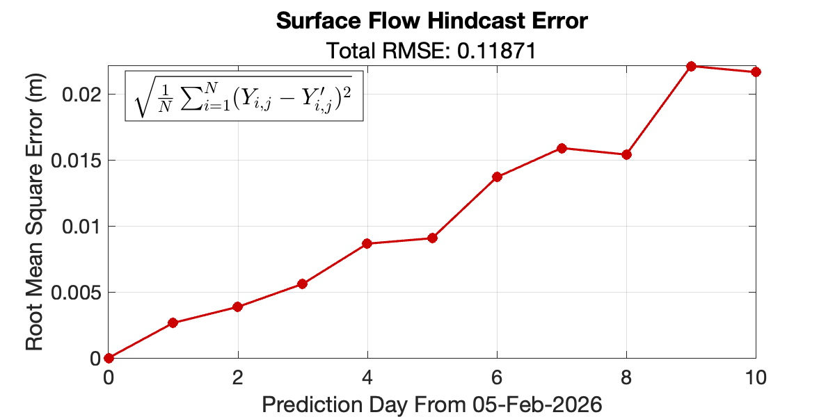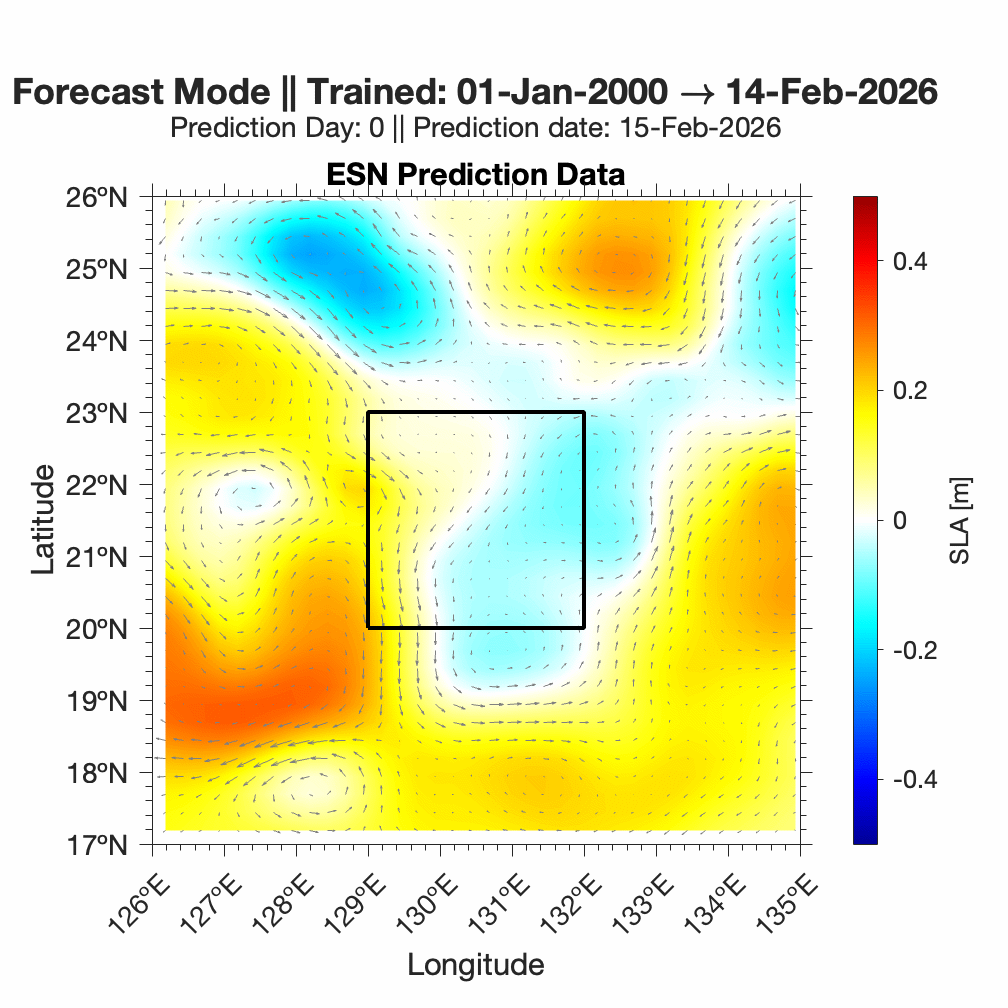 Forecasts of ocean surface flow are generated using an Echo State Network (ESN). The ESN predicts Sea Level Anomaly (SLA), which is converted to surface flow. Hindcast data below can be used to assess prediction skill. The forecast data below can be used to optimize future control strategies. See available plots in the list below.