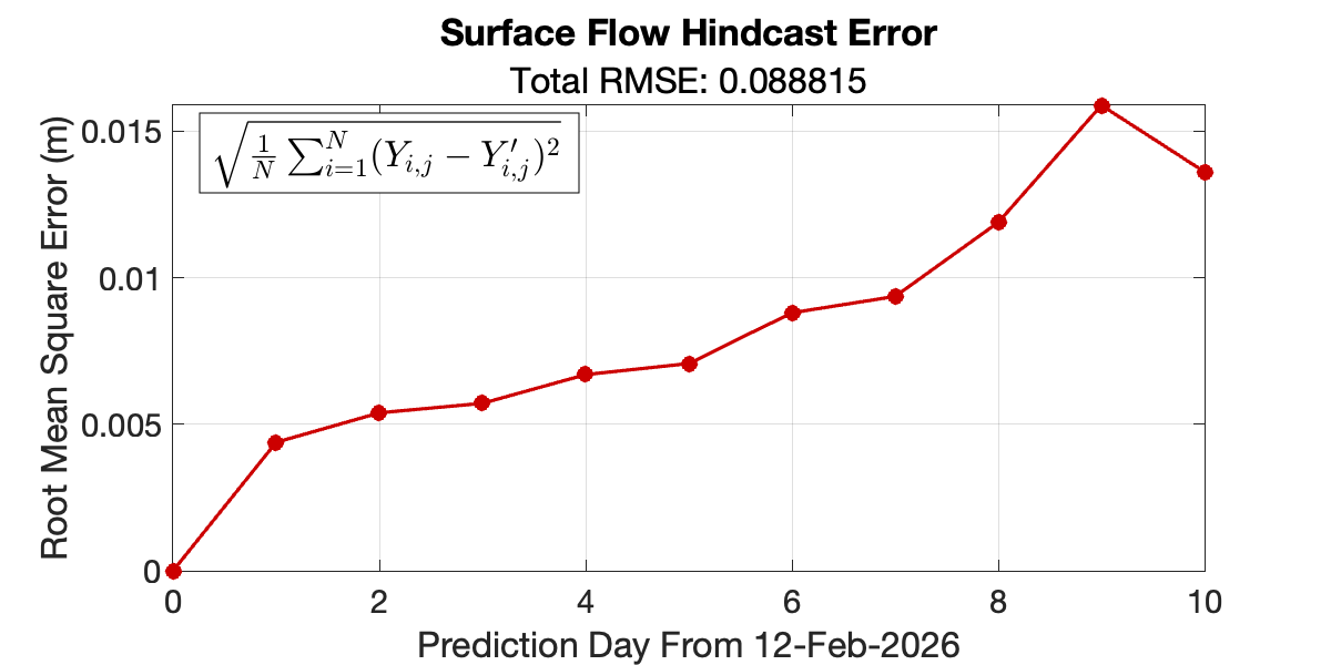 Forecasts of ocean surface flow are generated using an Echo State Network (ESN). The ESN predicts Sea Level Anomaly (SLA), which is converted to surface flow. Hindcast data below can be used to assess prediction skill. The forecast data below can be used to optimize future control strategies. See available plots in the list below.