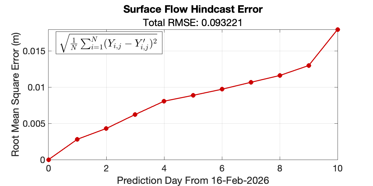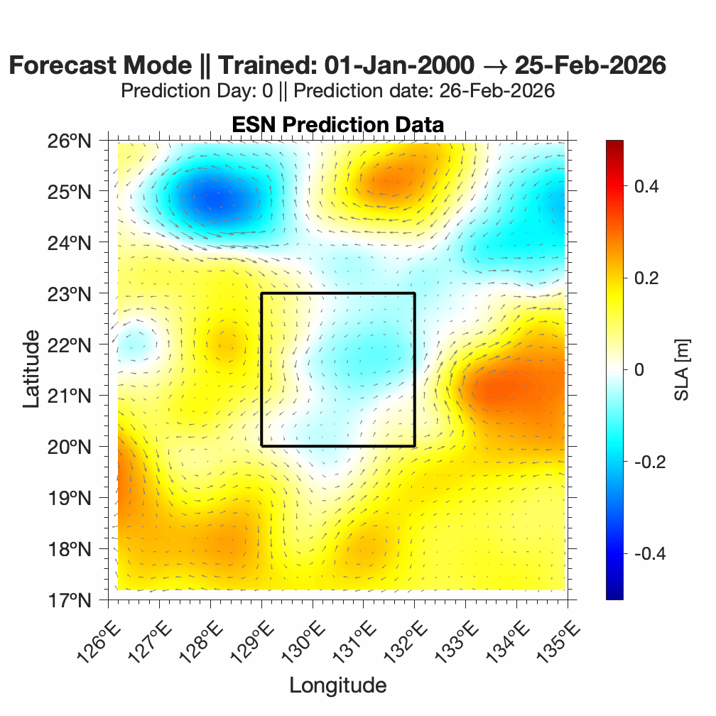 Forecasts of ocean surface flow are generated using an Echo State Network (ESN). The ESN predicts Sea Level Anomaly (SLA), which is converted to surface flow. Hindcast data below can be used to assess prediction skill. The forecast data below can be used to optimize future control strategies. See available plots in the list below.