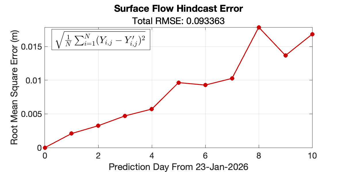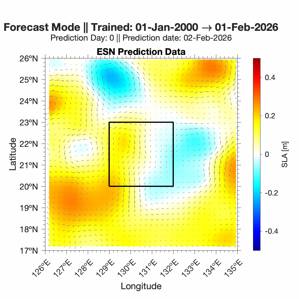 Forecasts of ocean surface flow are generated using an Echo State Network (ESN). The ESN predicts Sea Level Anomaly (SLA), which is converted to surface flow. Hindcast data below can be used to assess prediction skill. The forecast data below can be used to optimize future control strategies. See available plots in the list below.