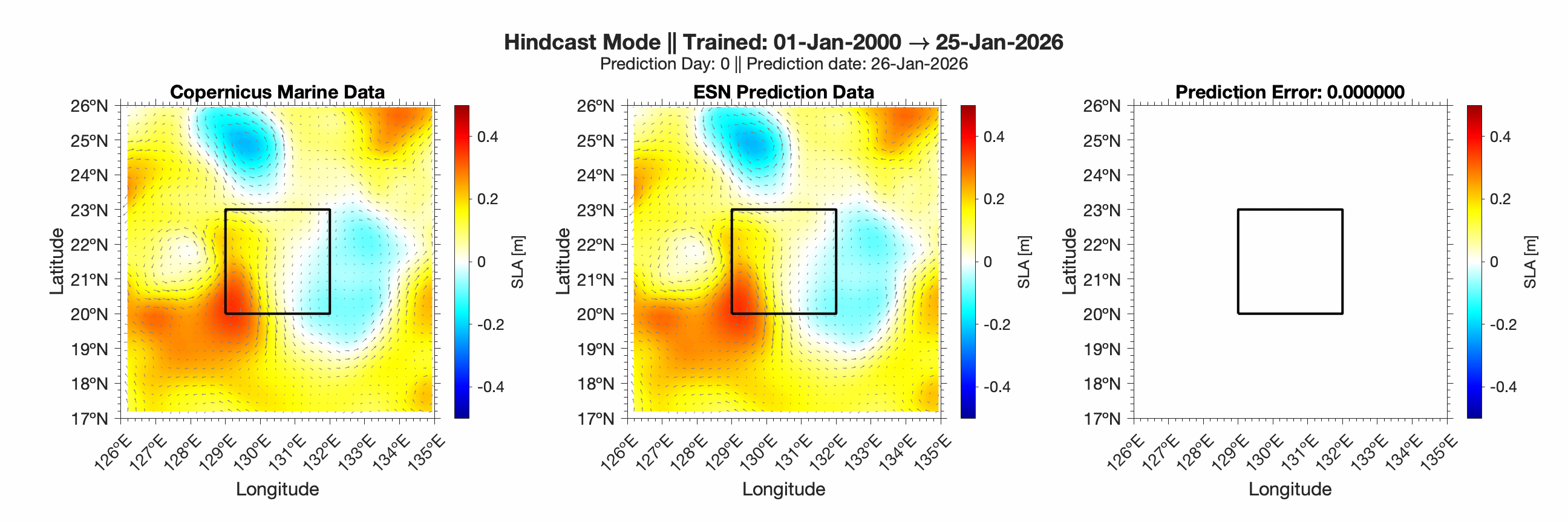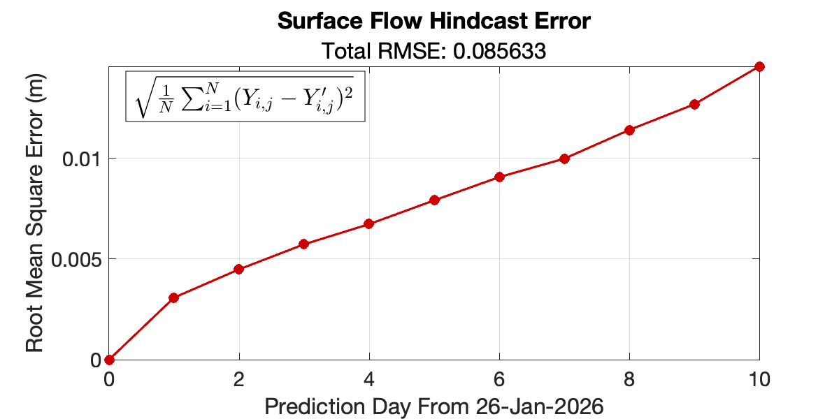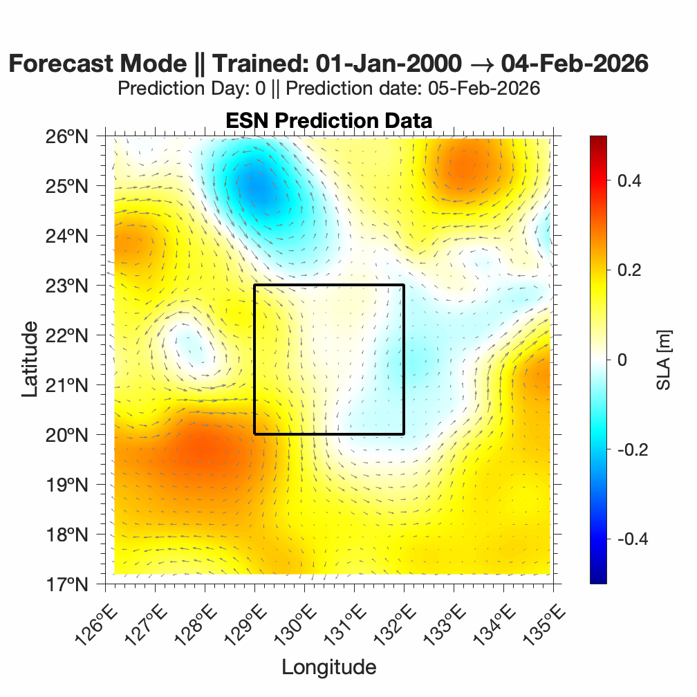 Forecasts of ocean surface flow are generated using an Echo State Network (ESN). The ESN predicts Sea Level Anomaly (SLA), which is converted to surface flow. Hindcast data below can be used to assess prediction skill. The forecast data below can be used to optimize future control strategies. See available plots in the list below.