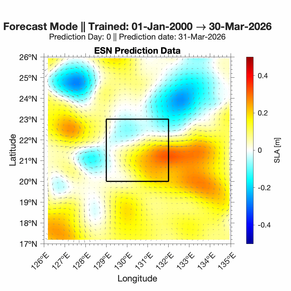 Forecasts of ocean surface flow are generated using an Echo State Network (ESN). The ESN predicts Sea Level Anomaly (SLA), which is converted to surface flow. Hindcast data below can be used to assess prediction skill. The forecast data below can be used to optimize future control strategies. See available plots in the list below.