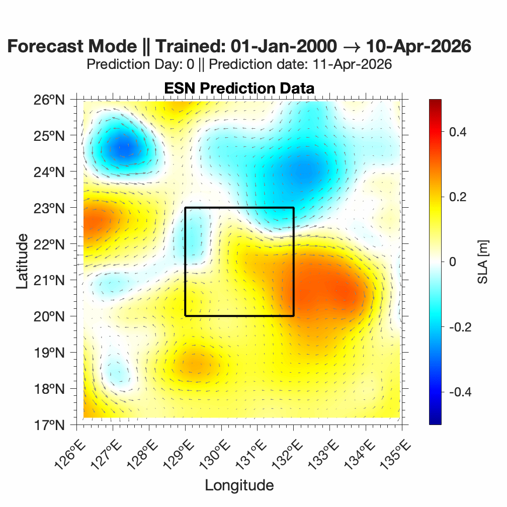 Forecasts of ocean surface flow are generated using an Echo State Network (ESN). The ESN predicts Sea Level Anomaly (SLA), which is converted to surface flow. Hindcast data below can be used to assess prediction skill. The forecast data below can be used to optimize future control strategies. See available plots in the list below.